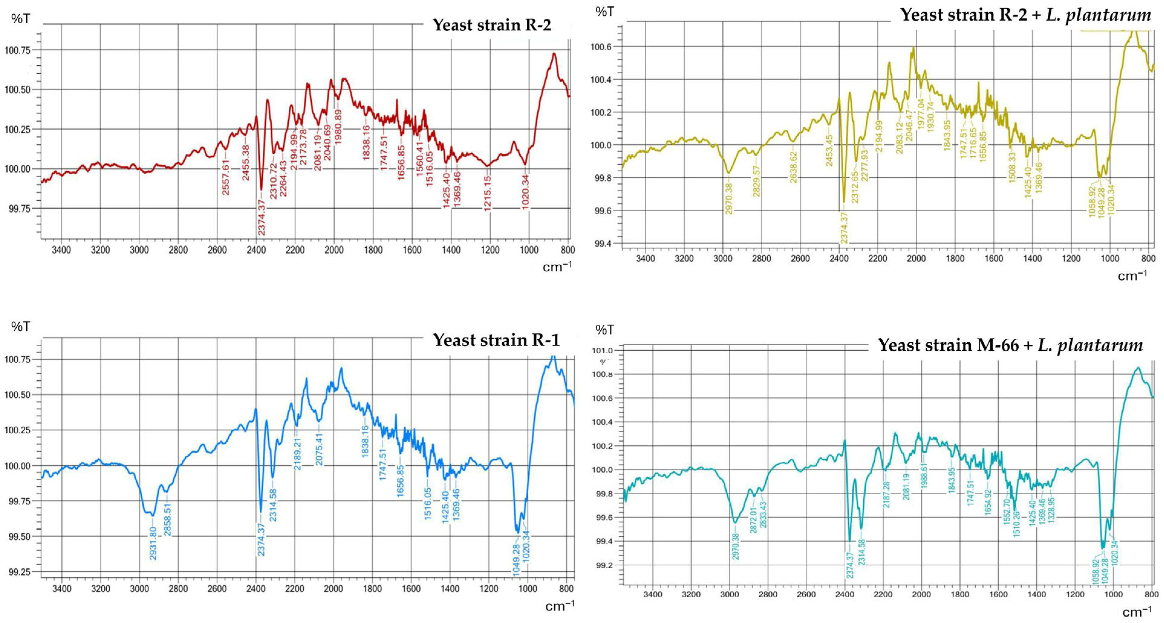 - Nenciarini, S.; Reis-Costa, A.; Pallecchi, M.; Renzi, S.; D’Alessandro, A.; Gori, A.; Cerasuolo, B.; Meriggi, N.; Bartolucci, G.L.; Cavalieri, D. Investigating Yeast–Lactobacilli Interactions through Co-Culture Growth and Metabolite Analysis. Fermentation 2023, 9, 933. [Google Scholar] [CrossRef]