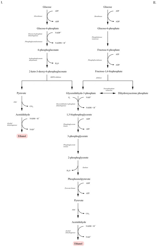 Comparison of the Entner–Doudoroff (ED) and Embden–Meyerhof–Parnas (EMP) pathways leading to alcoholic fermentation. In the ED pathway (I), glucose is converted through glucose-6-phosphate, 6-phosphogluconate, and 2-keto-3-deoxy-6-phosphogluconate (KDPG), yielding pyruvate and glyceraldehyde-3-phosphate. In the EMP pathway (II), glucose is metabolized through glucose-6-phosphate, fructose-1,6-bisphosphate, and glyceraldehyde-3-phosphate. In both pathways, pyruvate is decarboxylated to acetaldehyde by pyruvate decarboxylase (PDC), followed by reduction to ethanol by alcohol dehydrogenase (ADH). Scheme adapted from [21].