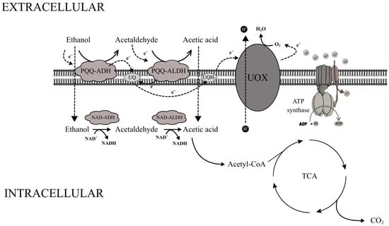 Electrons released during ethanol and acetaldehyde oxidation are transferred from PQQ to ubiquinone (UQ), which acts as a mobile electron carrier. Reduced ubiquinone (ubiquinol, UQH2) donates electrons to ubiquinol oxidase (UOX), which transfers them to molecular oxygen, the terminal electron acceptor. This reaction yields water, while proton translocation across the membrane generates a proton motive force that drives ATP synthesis via ATP synthase [83,84,85,86].