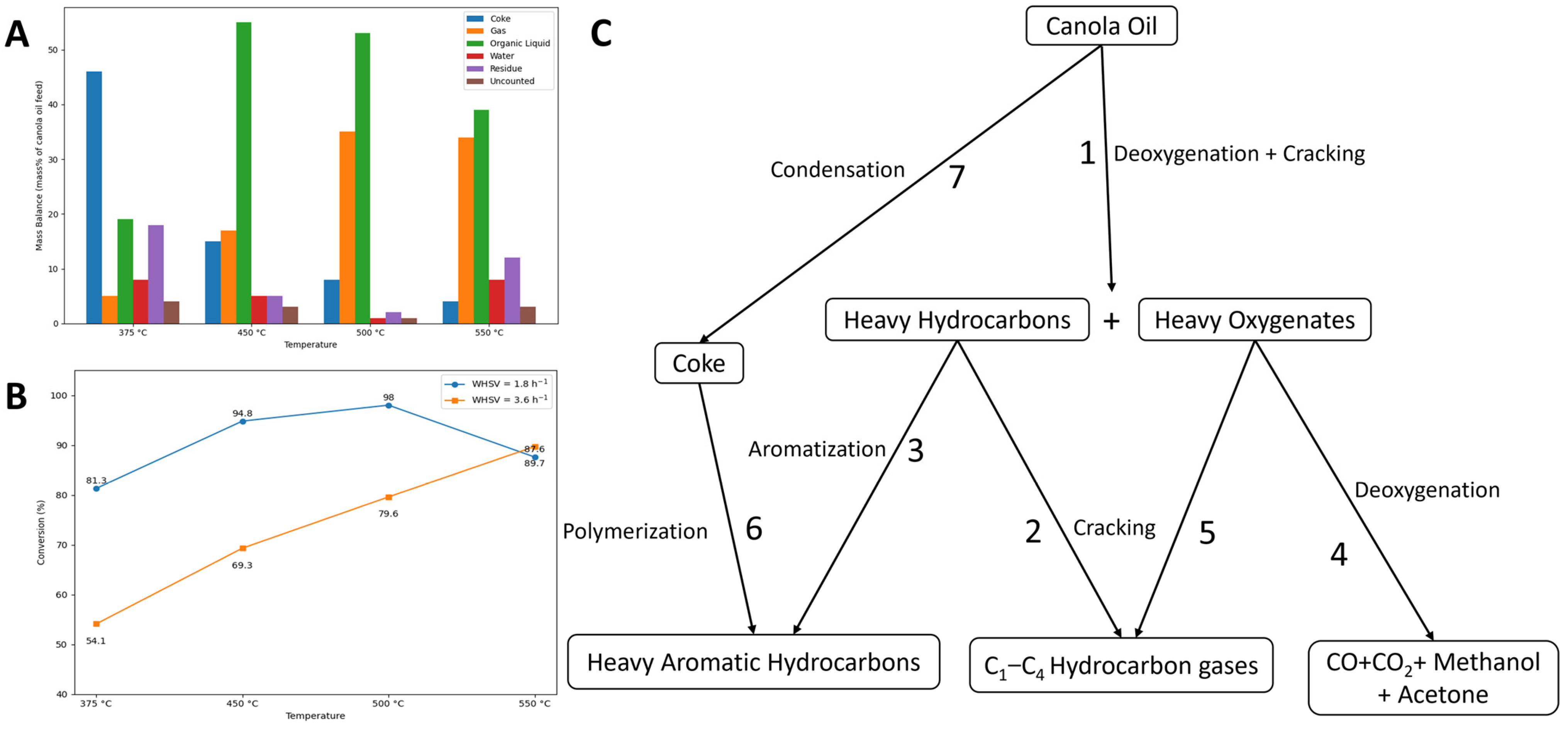 36]. Collectively, these reactions contribute to the conversion of oxygenated and heavy compounds into lighter hydrocarbons with improved stability and energy density. The role of the catalyst in CC is to promote the removal of most of the oxygen in selective ways and convert the active species to stable and useful components in bio-oil [