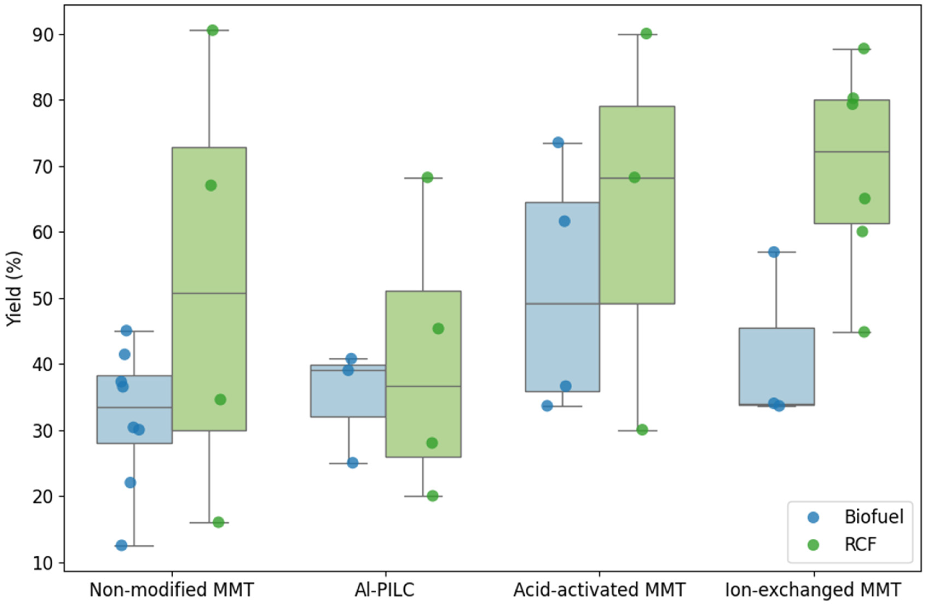 The results demonstrate that catalyst type strongly affects both the magnitude and variability of yields. For biofuel production, non-modified MMT yielded moderate oil conversion with a relatively narrow interquartile range (IQR = 10.3%), indicating consistent performance but limited enhancement. In contrast, RCF conversion with the same catalyst achieved higher median yields, yet displayed considerably larger variability (IQR = 42.96%), suggesting less predictable outcomes under similar conditions. Al-PILC and acid-activated MMT showed analogous trends: biofuel yields were consistently lower than those for RCF, while their smaller IQRs indicate better reproducibility for biofuel applications.