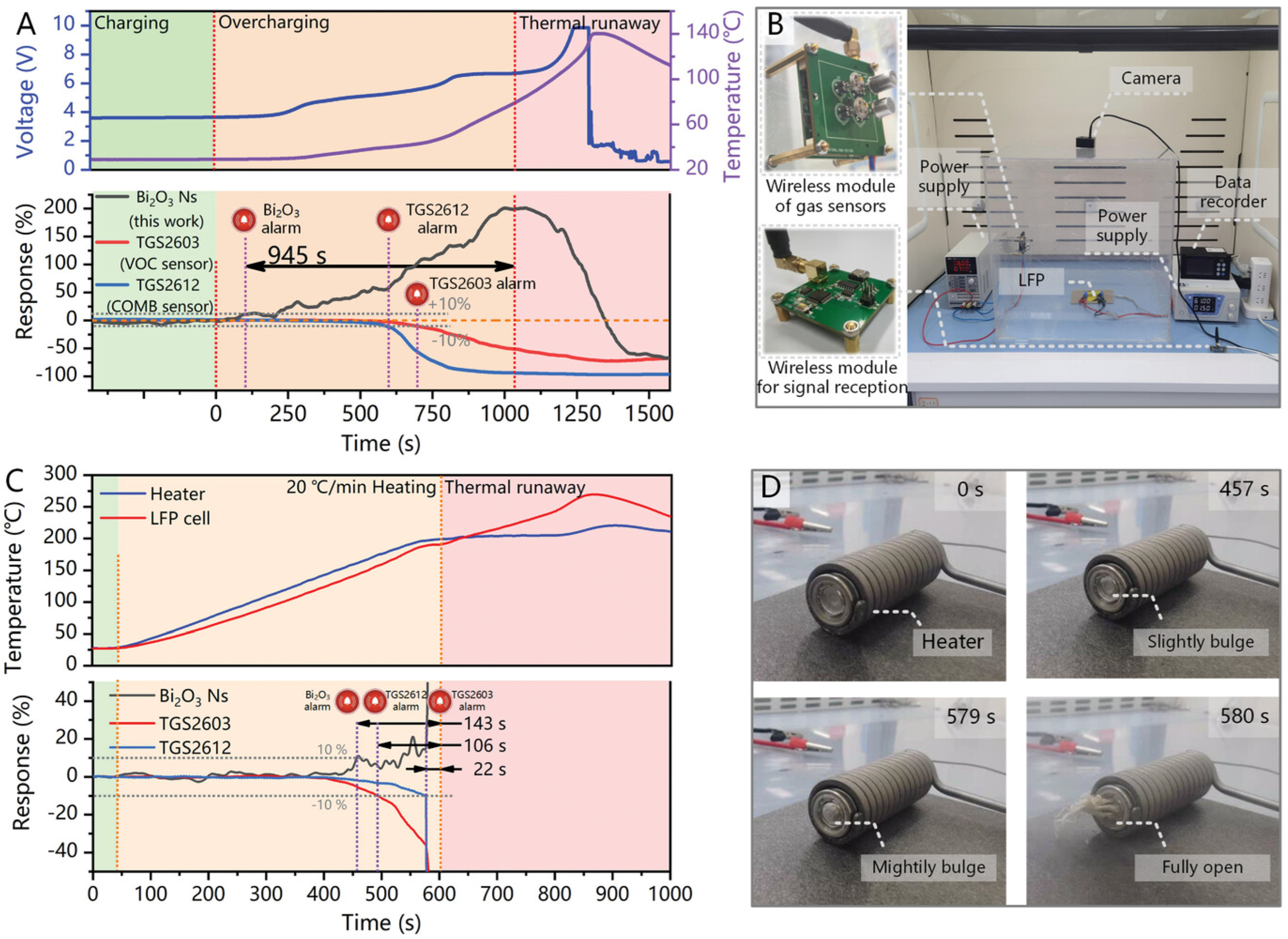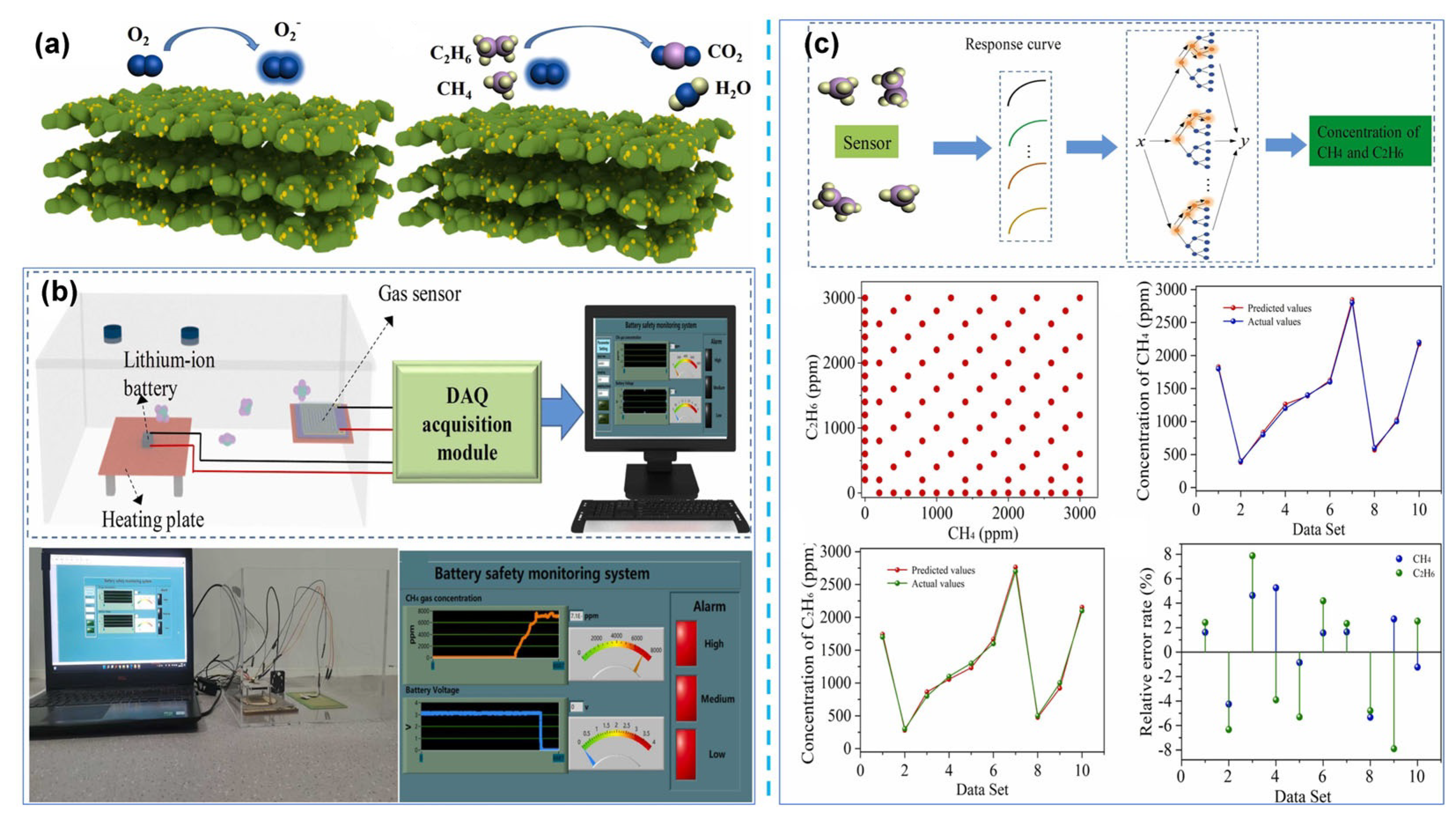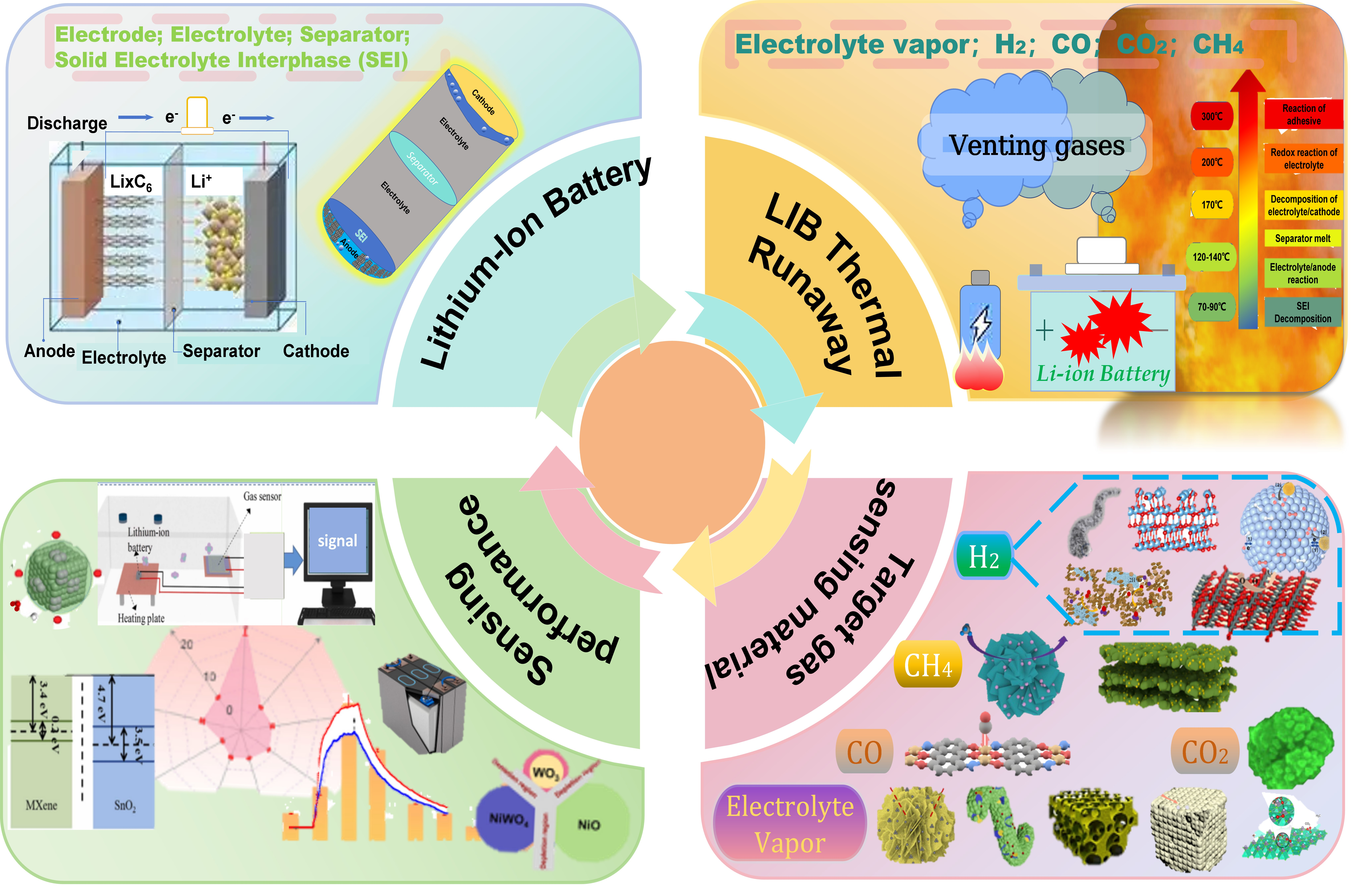 - Higher design requirements for semiconductor sensors in TR gas monitoring. Existing studies inevitably have certain limitations. For instance, some semiconductor materials suffer from issues such as excessively high operating temperatures, insufficient long-term stability, baseline drift, and prolonged response time. This needs further improvement to better align with the needs of TR warning applications. This requires the development of sensors capable of operating at lower temperatures to reduce power consumption while avoiding safety hazards caused by excessive heat. Additionally, improving the long-term stability of sensing materials is critical for achieving continuous monitoring of battery safety status, and minimizing sensor size is necessary to better adapt to battery management systems. Furthermore, higher requirements are placed on the response speed and sensitivity of semiconductor sensors: faster and more sensitive responses provide ample time for TR warning and remediation. Therefore, further optimization of sensing materials is required to improve their gas-sensing performance.