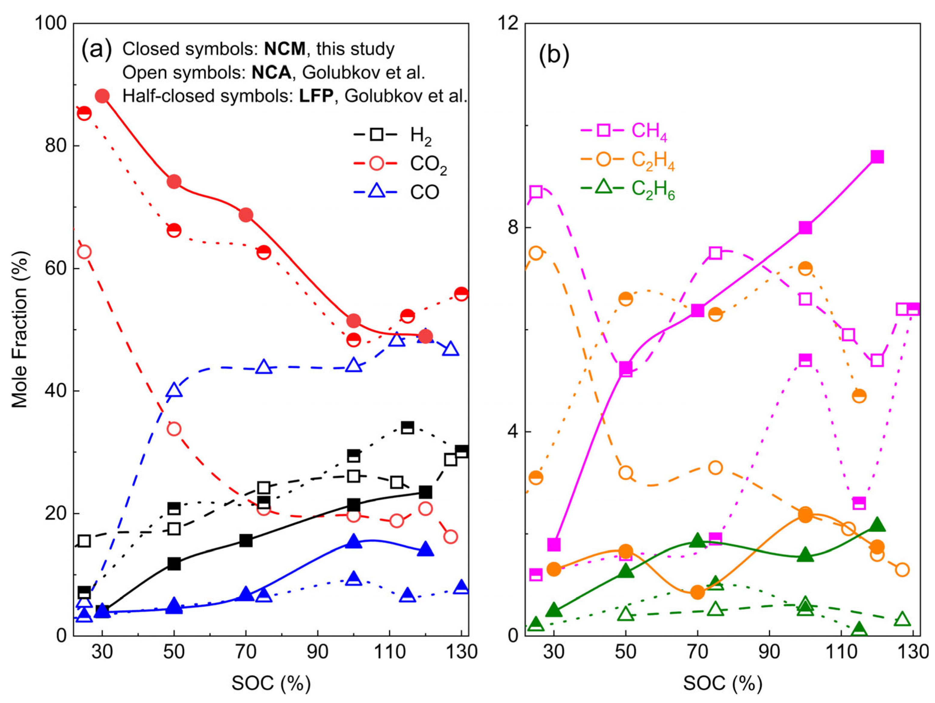 | Battery Chemistry | H2 (%) | CO (%) | CO2 (%) | CH4 (%) | C2H2 (%) | C2H4 (%) | C2H6 (%) |