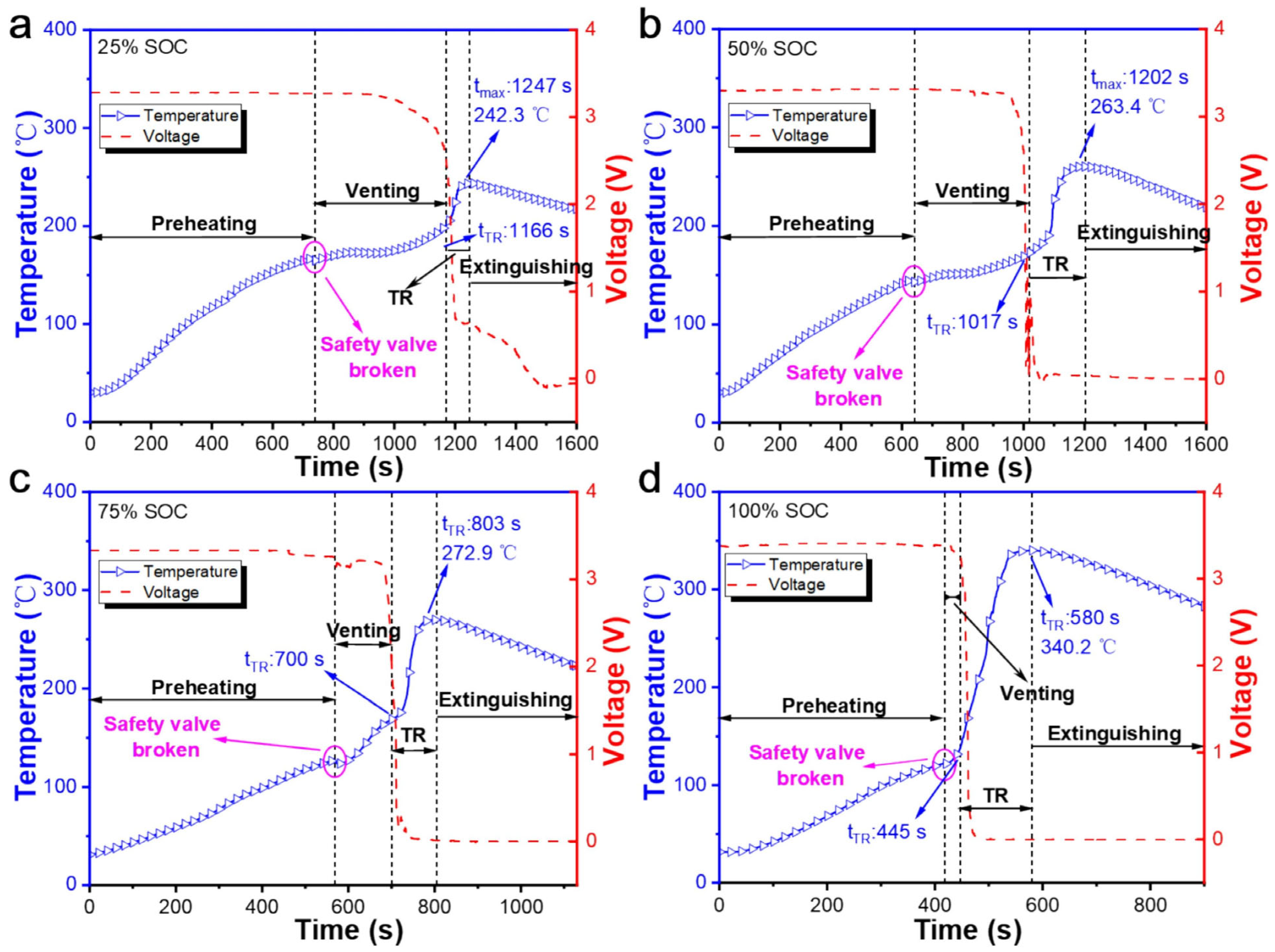 - Differences in overcharging time and battery venting time. In study [74], the interval from the start of overcharging to battery venting was 971 s, whereas in [75], this interval was only 324 s. Obviously, the overcharging time of the batteries in [74] was much longer than that in [75]. Overcharging time may reflect the extent to which TR progresses; at this point, the chemical reactions occurring inside the two sets of batteries differ, resulting in differences in the detected gases.