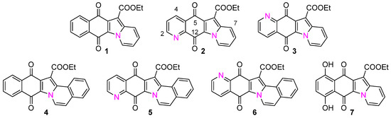 Molecular structures of indolizinoquinolinedione derivatives and analogs under investigation: ethyl 5,12-dihydro-5,12-dioxoindolizino[3,2-g]quinoline-11-carboxylate (1), ethyl 5,12-dihydro-5,12-dioxoindolizino[2,3-g]quinoline-6-carboxylate (2), ethyl 5,12-dihydro-5,12-dioxoindolizino[3,2-g]quinoline-11-carboxylate (3), ethyl 8,13-dihydro-8,13-dioxobenz[5,6]indolo[2,1-a]isoquinoline-14-carboxylate (4), ethyl 8,13-dihydro-8,13-dioxobenz[7,8]indolizino[2,3-g]quinoline-14-carboxylate (5), ethyl 8,13-dihydro-8,13-dioxobenz[7,8]indolizino[3,2-g]quinoline-14-carboxylate (6), ethyl 6,11-dihydro-7,10-dihydroxy-6,11-dioxobenzo[f]pyrido[1,2-a]indole-12-carboxylate (7).