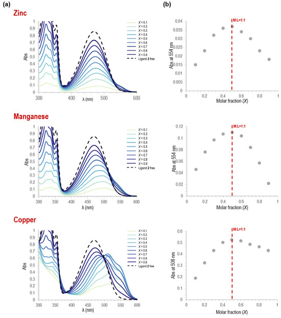 The structural characterization has been mainly studied in solution, considering also solvents that can reproduce the conditions used in the biological evaluation. We have investigated the UV absorption of 2 as a ligand in a Zn(II) complex solubilized in solvents of different polarity, whose choice was forced by having the chloride salt and the compound 2 both soluble in the initial solutions. The use of polar protic solvents like methanol, ethanol, or water was instead prevented by the observation that molecule 2 did not form the complex in these solutions at the same 1.5 × 10−4 M concentration. We observed different behaviors between the free ligand (in dichloromethane and acetonitrile, obtaining comparable absorption profiles) and the chelate in dichloromethane and acetonitrile (Figure S1). In both cases, the stoichiometry of the metal–ligand complex was determined from the continuous variation method consisting of a photometric titration (Job’s method) [15]. In dichloromethane solution, the stoichiometry of ligand 2/zinc(II) ion resulted 3:1 (Figure S2), whereas in acetonitrile it was 1:1. The same stoichiometry was obtained in acetonitrile for the Cu(II) and Mn (II) chelates (Figure 2).