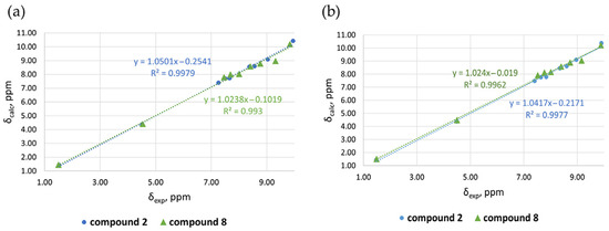 After carefully selecting the best combination of functional and basis set, we carried out DFT calculations at the M06-L/x2c-TZVPAll-s level of theory. A good linear fit was obtained between the experimental and calculated chemical shifts for the protons in the structure of Zn complex (8), validated by data obtained for free ligand 2 (Table 2, Figure 3).