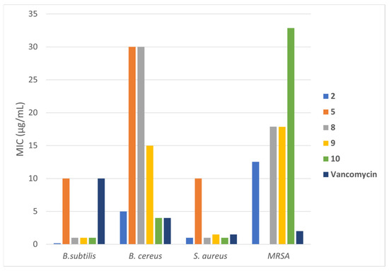 Figure 4 displays a comprehensive comparative view of the strain inhibitions observed for the most active compounds compared to vancomycin.