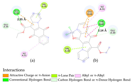 Two-dimensional representations for the interactions of compounds 2 (a) and complex 8 (b) in the receptor site of FtsZ (2VAM) with indication of interaction types and H-bond distance, as deduced by docking calculations.