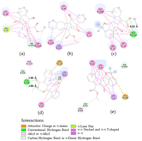 Two-dimensional representations for the interactions of the following: at the top, compounds 2 (a), 5 (b) and complex 8 (c) in the receptor site of (5IWI); at the bottom, compound 2 (d) and its zinc complex 8 (e) in the receptor site of DNA gyrase (2XCT), with indication of interaction types and H-bond distance, as deduced by docking calculations.