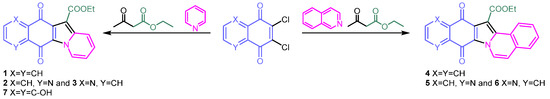 In a one-pot multicomponent cyclization for obtaining the desired compounds, ethyl acetoacetate and pyridine were treated with 2,3-dichloronaphthalene-1,4-dione to provide compound 1, and with 6,7-dichloroquinoline-5,8-dione to give a mixture of the N,N-syn isomer 2 and N,N-anti isomer 3 (Scheme 1). The selectivity of this reaction is affected by the choice of solvent and the presence of a suitable metal salt. Regioisomers 2 and 3 were purified by column chromatography, and their structures were established by extensive NMR analysis and comparison with a reference compound derived from decarboxylation [10]. This synthetic procedure became more efficient when microwave irradiation replaced conventional heating [11]. Similarly, compound 7 was obtained starting from the commercial 2,3-dichloro-5,8-dihydroxy-1,4-naphtoquinone [9]. The aza- and diaza-dibenzofluorenedione esters 4 and 5/6 were accessible by cyclization of ethyl acetoacetate and isoquinoline with the corresponding dichloroquinone, respectively (Scheme 1) [11].
