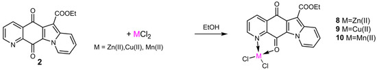 Compound 2, the most active of analogs 1–7 in the antibacterial tests (see below), was considered as an N/O bidentate ligand for obtaining the metal complexes 8–10 (Scheme 2). The metal chelates were produced by treating compound 2 with the chloride salts of zinc, copper, and manganese divalent ions. We had already investigated a similar N,O metal chelation of 6,7-dichloroquinoline-5,8-dione, which was able to affect the regioselectivity of amination [10], where Raman spectroscopy combined with DFT calculations in the characterization of the key intermediate metal complexes could be used to detect the best selectivity [13].