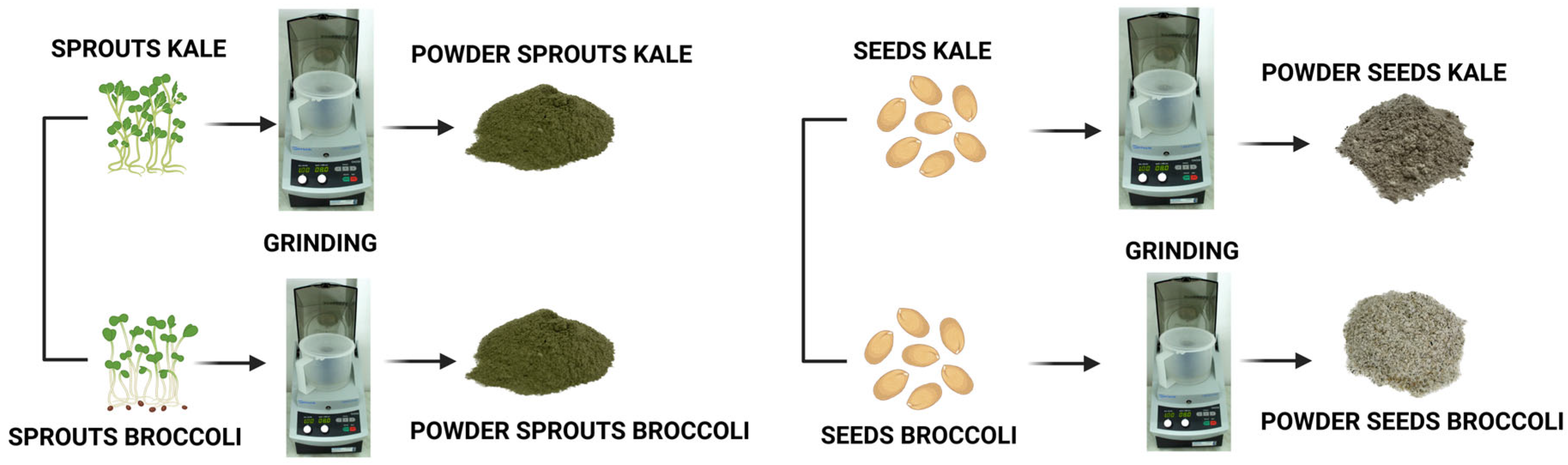 2.3. Evaluation of the Nutritional Composition of Kale and Broccoli Seed and Sprout Powders