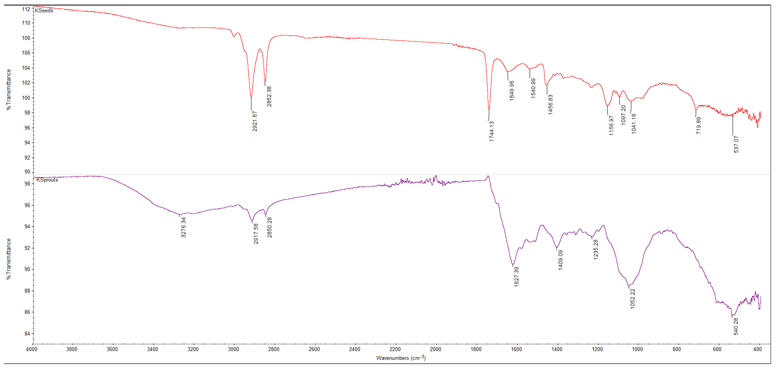 | KSeeds | 2.76 ± 0.11 b | 1.43 ± 0.12 b | 11.79 ± 0.70 b | 30.90 ± 0.29 a | 53.12 ± 0.76 b | 537.72 ± 1.10 b |