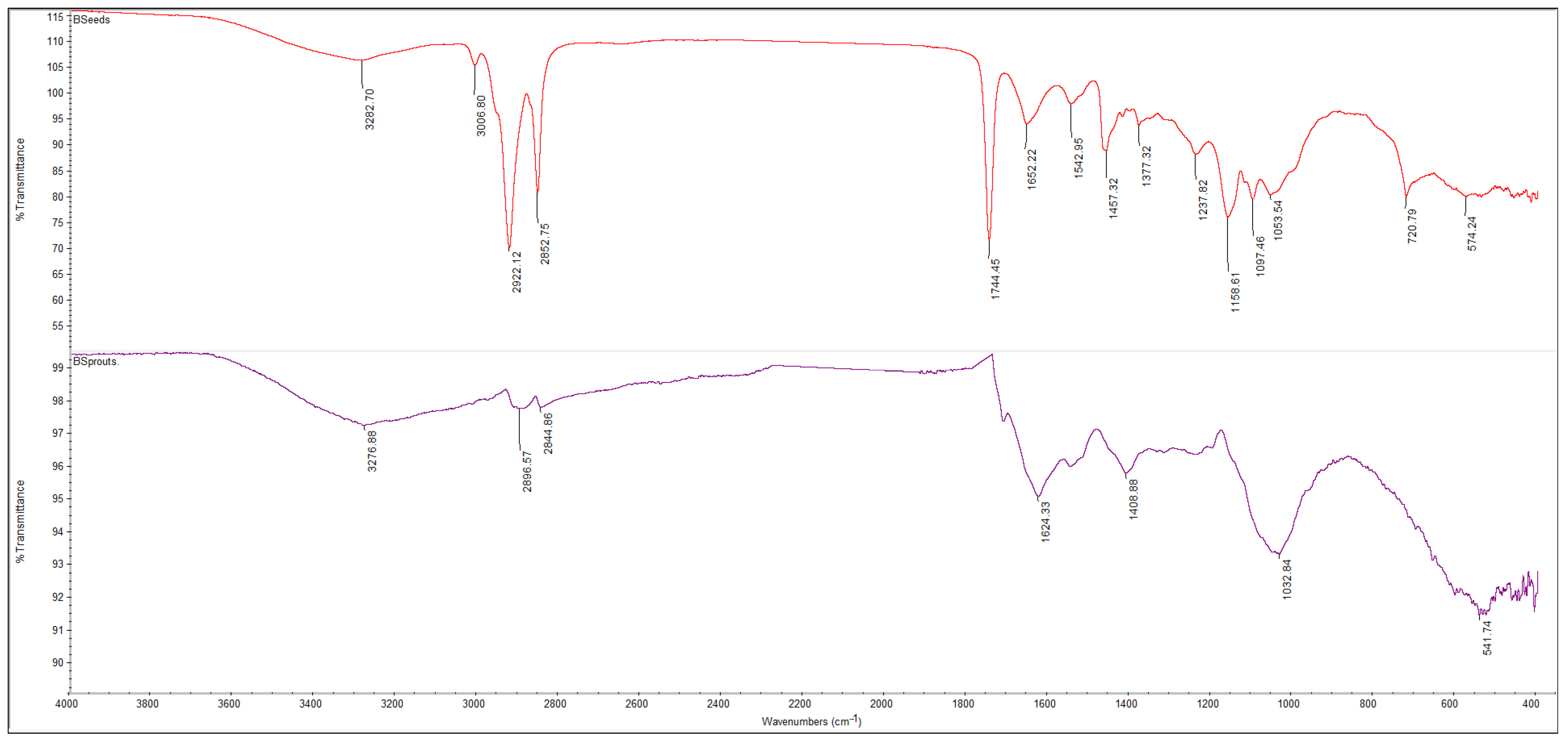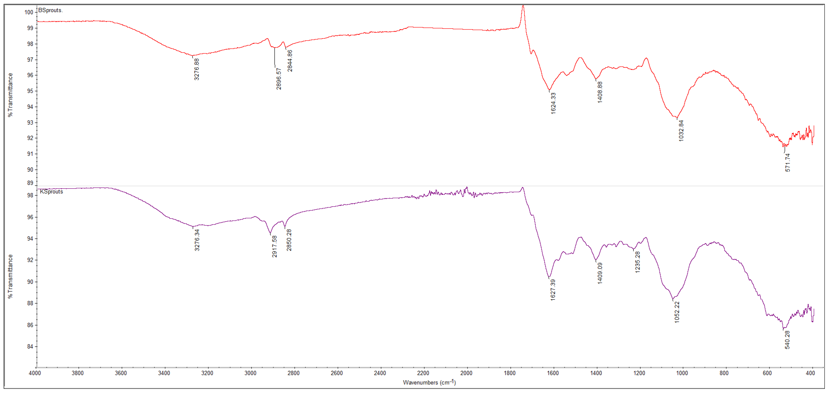 2.6. Structural Analysis of Kale and Broccoli Seed and Sprout Powders