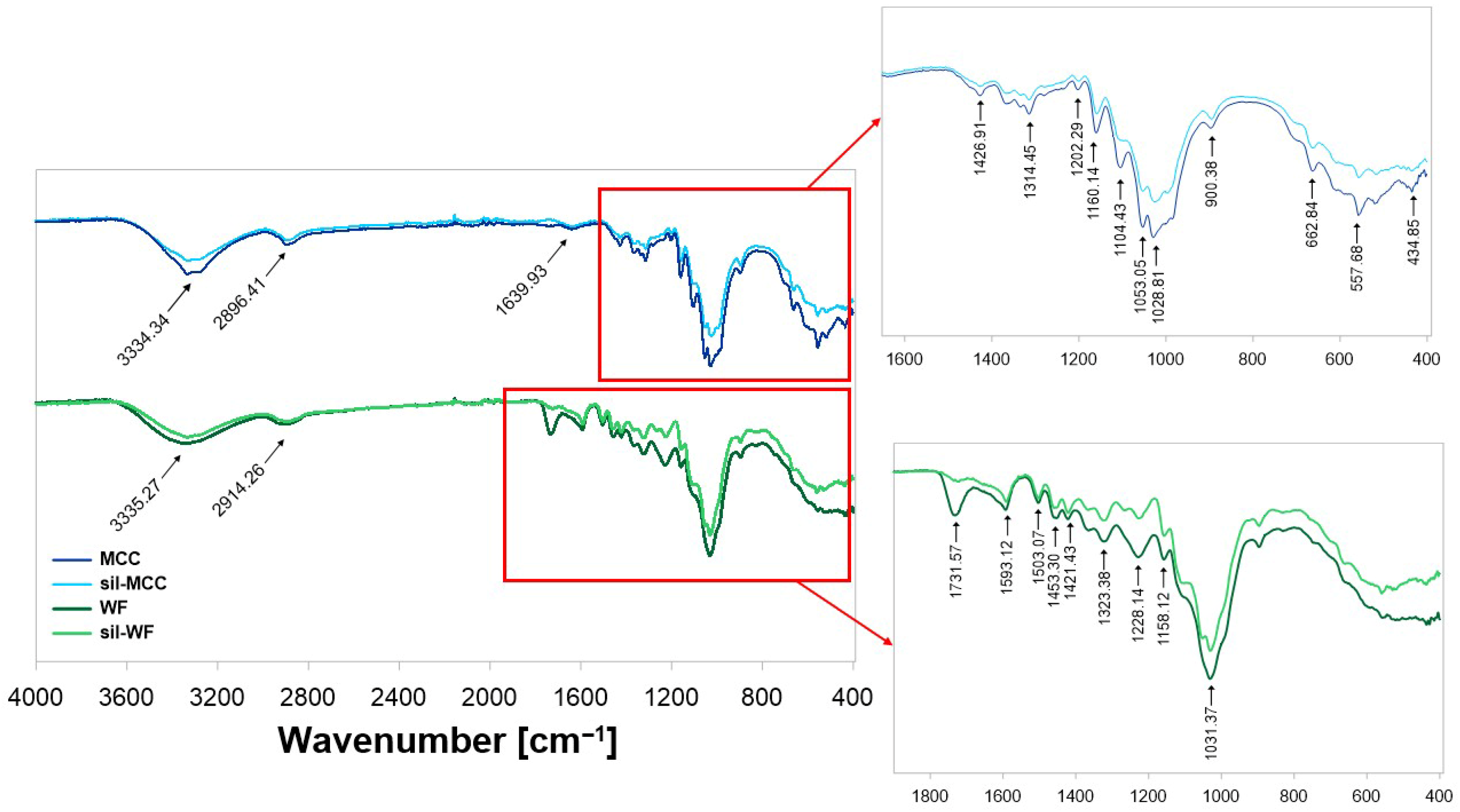 | 1743 | - | 1732 | - | Stretching vibrations in -C=O of hemicellulose or lignin |