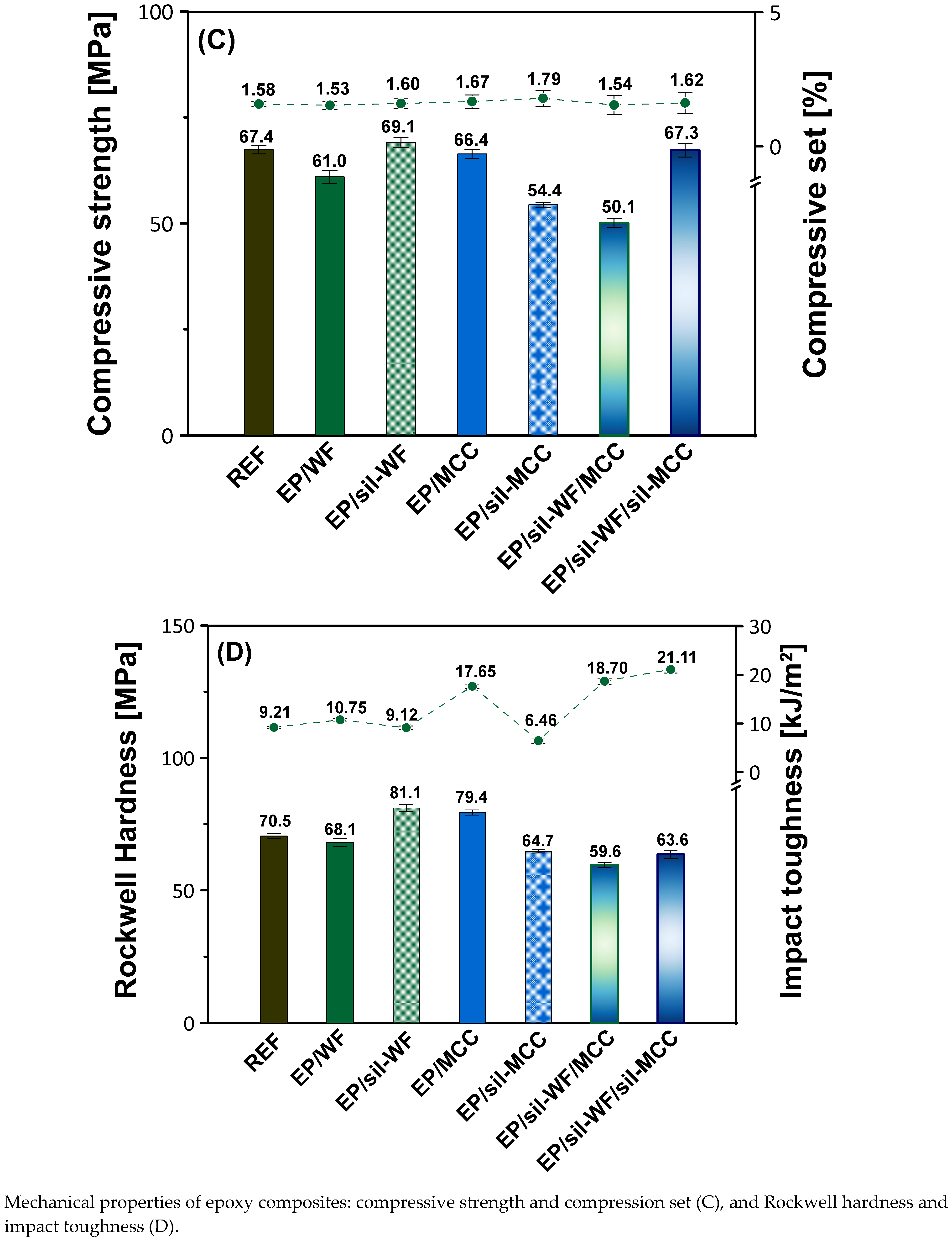 | EP/sil-WF/MCC | Cured epoxy composite based on low-molecular-weight epoxy resin Epidian 6 filled with 4 wt.% of silanized wood flour and 1 wt.% of unmodified microcrystalline cellulose. |