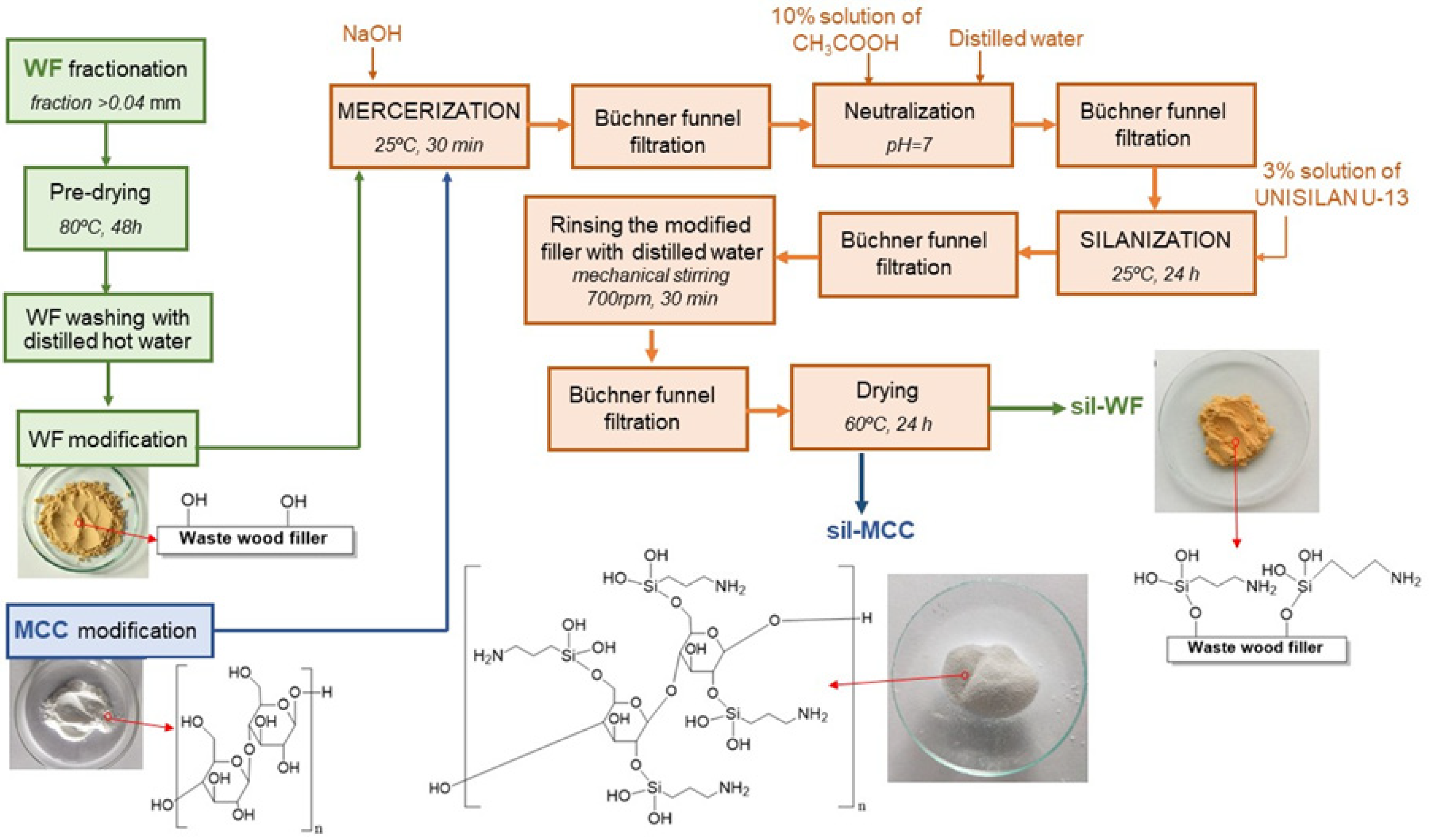- Olmedo-Navarro, M.; Pérez, J.M.; Gutiérrez-Segura, N.; Sánchez-Sevilla, B.; Soriano-Jerez, Y.; Alonso, D.A.; Fernández, I. High degree of silanization of olive wood shell stone and its use in polyester biocomposites. RSC Sustain. 2024, 2, 1030–1039. [Google Scholar] [CrossRef]