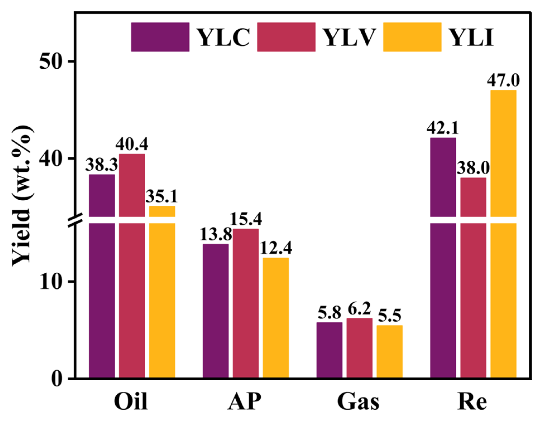 Figure 4 illustrates the results of DCL for YLC, YLV and YLI, comprising the yield of liquefied oil, asphaltene, gas and residue. The yields of oil, asphaltene and gas for YLV are 40.4, 15.4 and 6.2 wt.%, respectively, which are higher than those for YLC and YLI. Conversely, the residue yield of YLI is significantly higher than YLC and YLV, reaching 47.0 wt.%.