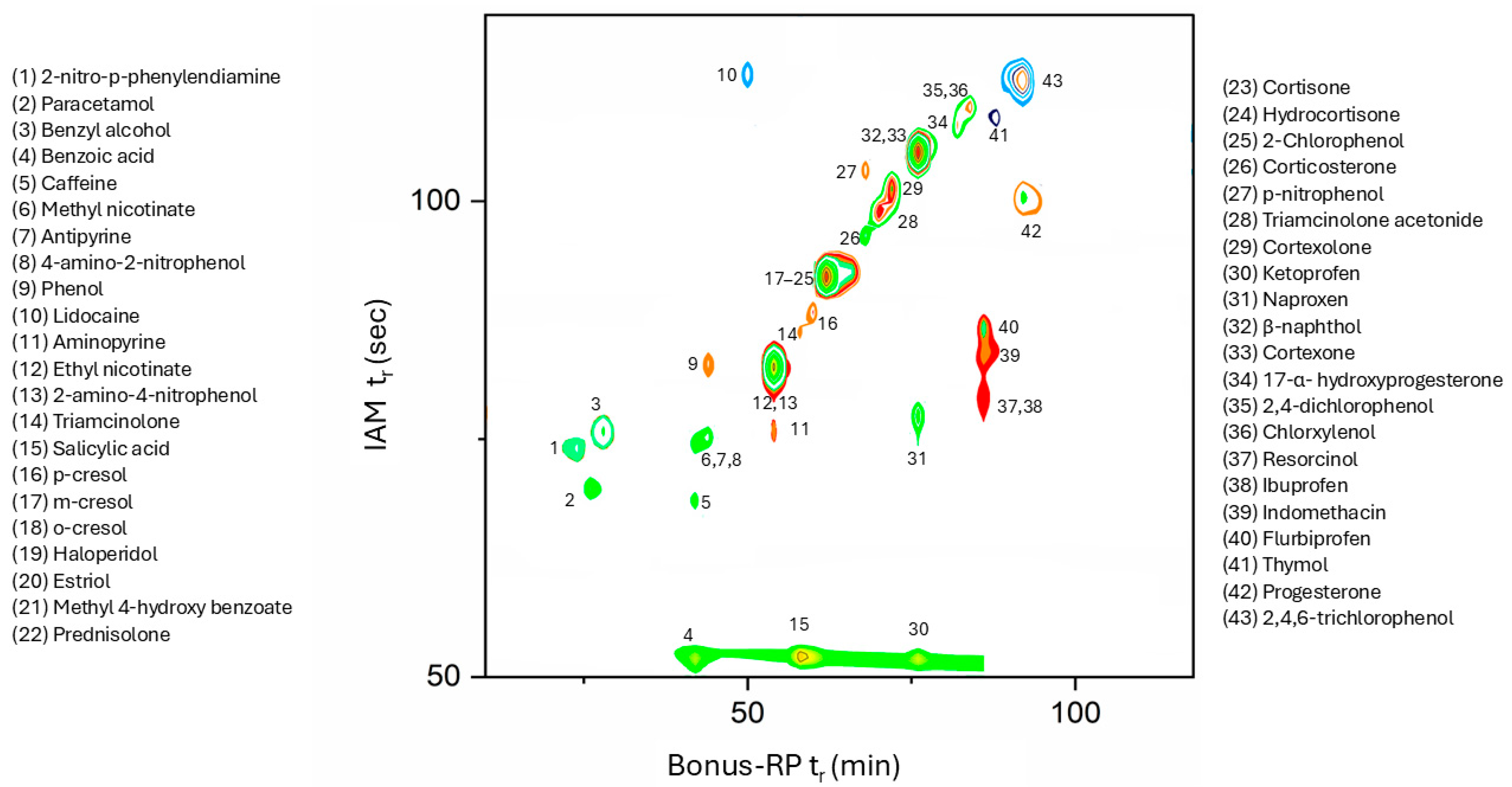 A comprehensive two-dimensional liquid chromatography platform (LC × LC) was developed and validated for dermal permeability studies. In this implementation, the two separation dimensions were applied to mimic the layered structure of human skin: a ceramide-like stationary phase in the first dimension (1D) to simulate the lipid-rich epidermis, and an immobilized artificial membrane (IAM) phase in the second (2D) to emulate the dermis. Experimental conditions were optimised to reflect the microenvironment of the in vivo skin. For validation purposes, 43 pharmaceutical and cosmetic compounds whose transdermal permeability coefficients (log Kp) were known from the scientific literature were selected as model solutes. A good degree of separation was achieved across the whole dataset, and affinity profiles correlated with transdermal passage properties, suggesting that retention within specific chromatographic ranges may be predictive of skin permeation. To complement this approach, mass diffusion measurements were also conducted using Permeapad® 96-well plates and LC was performed on a narrow bore column in MS-friendly conditions. These log Kp values were compared against both in vivo and chromatographic retention data. The combined use of these techniques offers a strategic framework for profiling new chemical entities for their dermal absorption in a manner that is both ethically compliant and eco-sustainable.