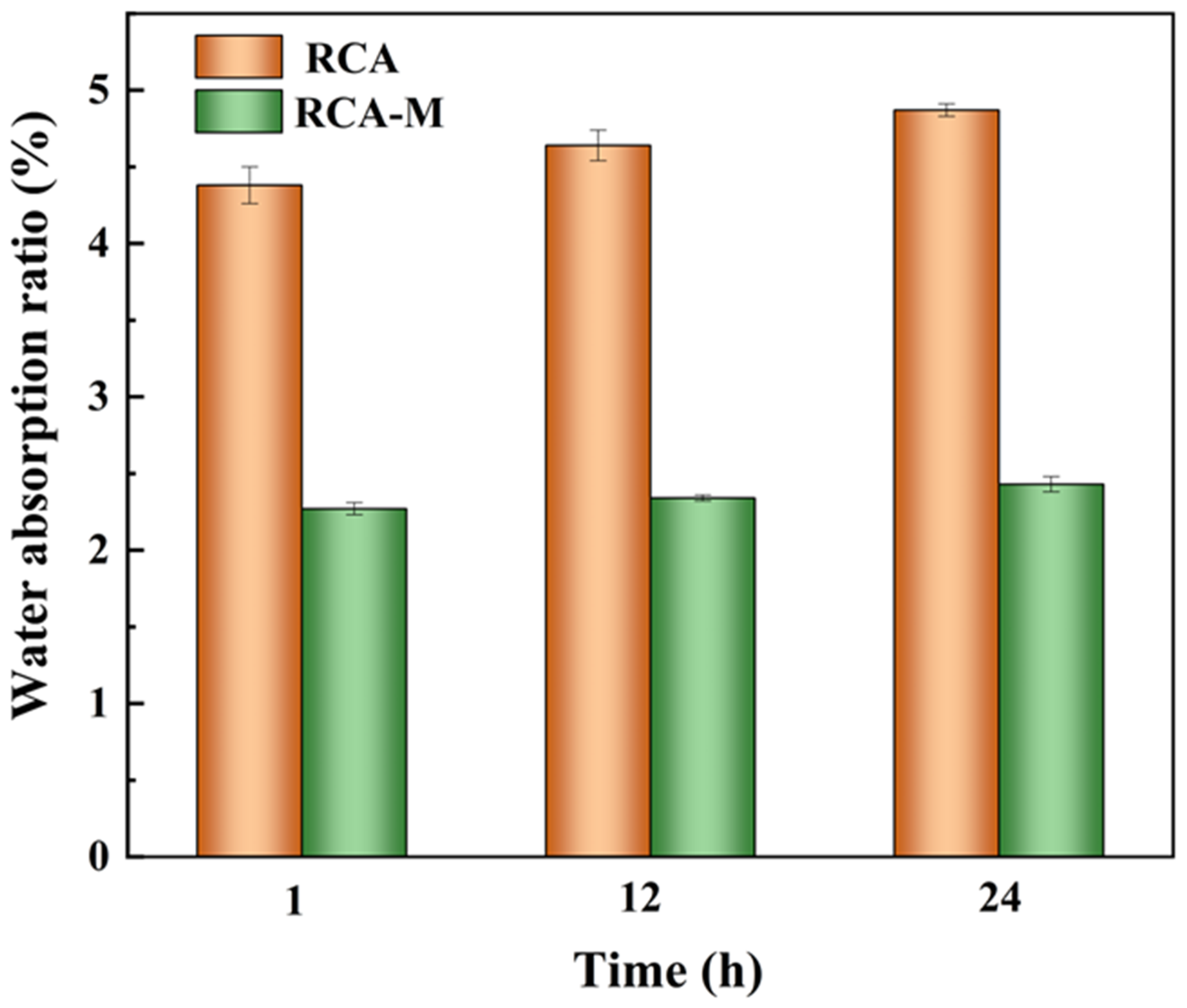 - Yin, J.; Kang, A.; Kou, C. Influences of Combined Treatment by Cement Slurry and Methyl Sodium Silicate Solution on Recycled Coarse Aggregate and Recycled Aggregate Concrete. Materials 2025, 18, 3832. [Google Scholar] [CrossRef]