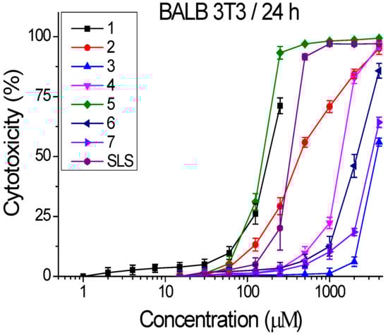 Compounds 1–7 were tested for cytotoxicity by an in vitro 3T3 NRU test, as described above. In this study, as a positive control SLS (sodium lauril sulfate) was used 1–250 µM. The concentrations of the tested compounds were in wide range from 15 to 4000 µM. The cells were cultivated with the compounds for 24 h, at 37 °C, 5% CO2, and 95% humidity. The cytotoxicity was expressed in percentages relative to the negative control. The effect was dose–response for all tested compounds. Results are shown in Figure 2.