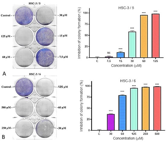 Inhibition of colony formation of Compounds 5 (A) and 6 (B) in HSC-3 cell line. Left coloring with MTT dye, right—graphical representation of the results in % inhibition of colony formation compared to the negative control (untreated cells).