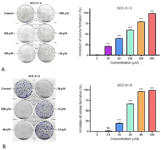 Inhibition of colony formation of Compounds 4 (A) and 6 (B) in SCC-9 cell line. Left coloring with MTT dye, right—graphical presentation of the results in % inhibition of colony formation compared to the negative control (untreated cells).
