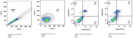 After 24 h treatment of HSC-3 cell line with IC50 doses of Compound 5, the increase in cells in early apoptosis was measured (1.03% in untreated control and 2.34% after treatment), but more obvious effect was observed in late apoptosis, where the increase was from 5.23% to 12.3%.