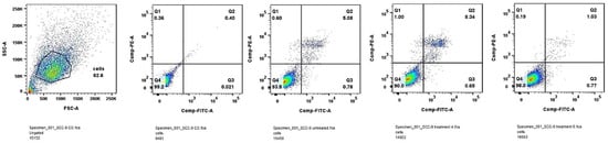 SCC-9 cell line was treated with IC50 doses of Compound 4 and Compound 6 for 24 h. As shown in Figure 6, Compound 4 increased the number of cells in late apoptosis, while Compound 6 suppressed late apoptosis comparing with untreated control. These findings indicate that in SCC-9 cells Compound 6 may suppress proliferation through non-lethal or early stress-related mechanisms, rather than inducing extensive apoptotic cell death. Hallmarks of late apoptosis are as follows: membrane integrity is lost, DNA fragmentation occurs, and the cell is effectively dead Annexin V positive and PI/7-AAD positive.