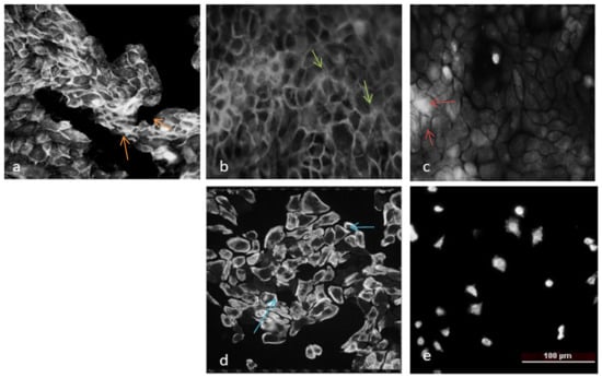 Actin staining of HaCaT cell line after treatment with IC50 concentration of studied Compounds: (a) untreated control, (b) Doxo—positive control, (c) compound 3, (d) compound 4, and (e) compound 6. Arrows: orange—stress fibers, green—actin near to cell membrane, red—diffuse actin, and blue—actin in cells.