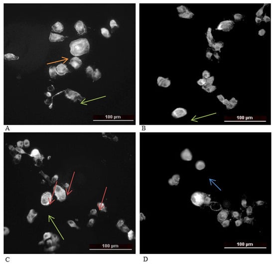 Actin staining of high metastatic HSC-3 cell line after treatment with IC50 concentration of studied compounds: (A) control, (B) Doxo—positive control, (C) Compound 5, and (D) Compound 6. Arrows: orange—stress fibers, green—circle like actin, red—actin near to the cell membrane, and blue—diffuse actine.