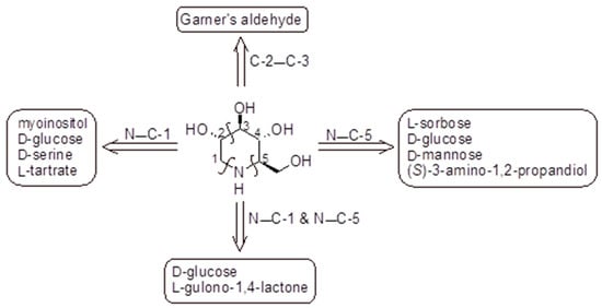 Preparation of DNJ based on the chiral pool approach: retrosynthetic analysis. The key steps closing the piperidine ring are highlighted above the arrows indicating the corresponding chiral starting materials [99,100,104].