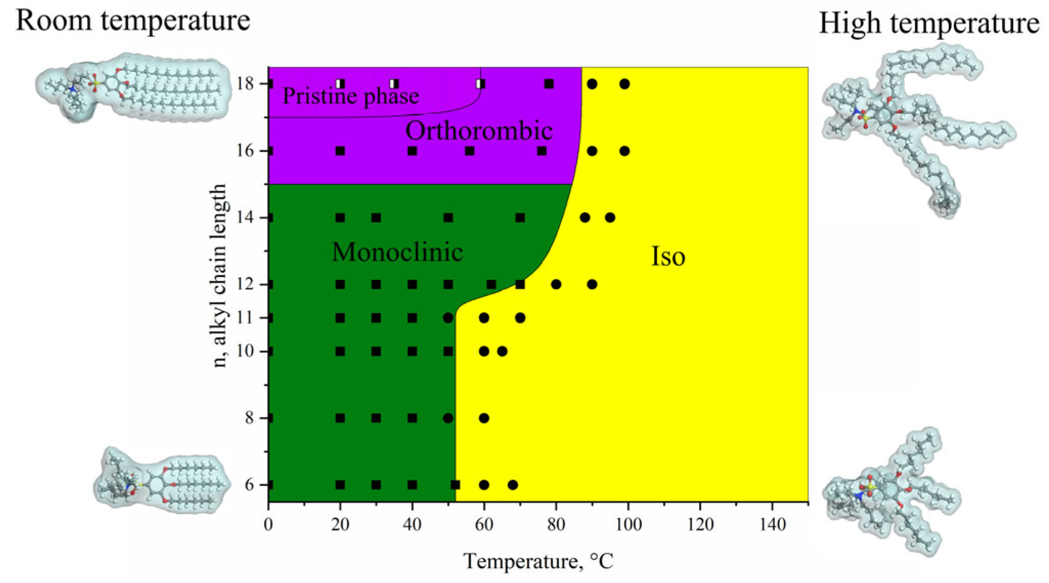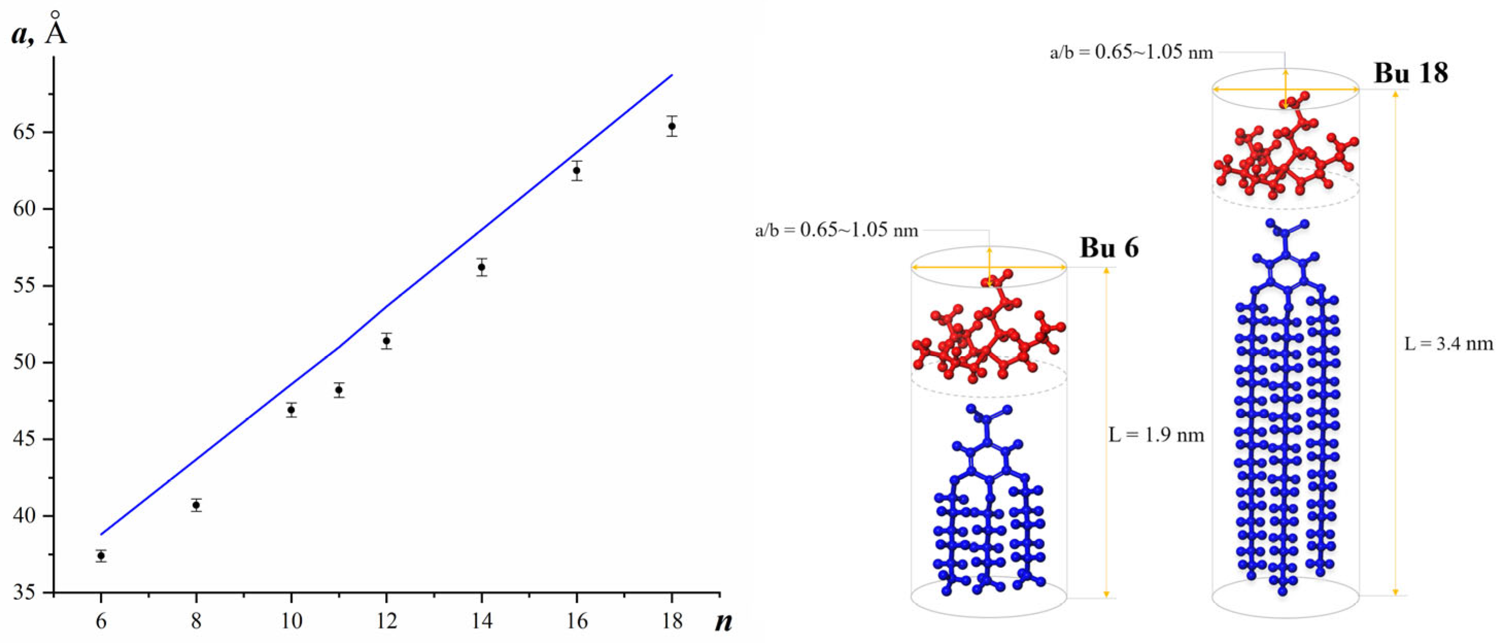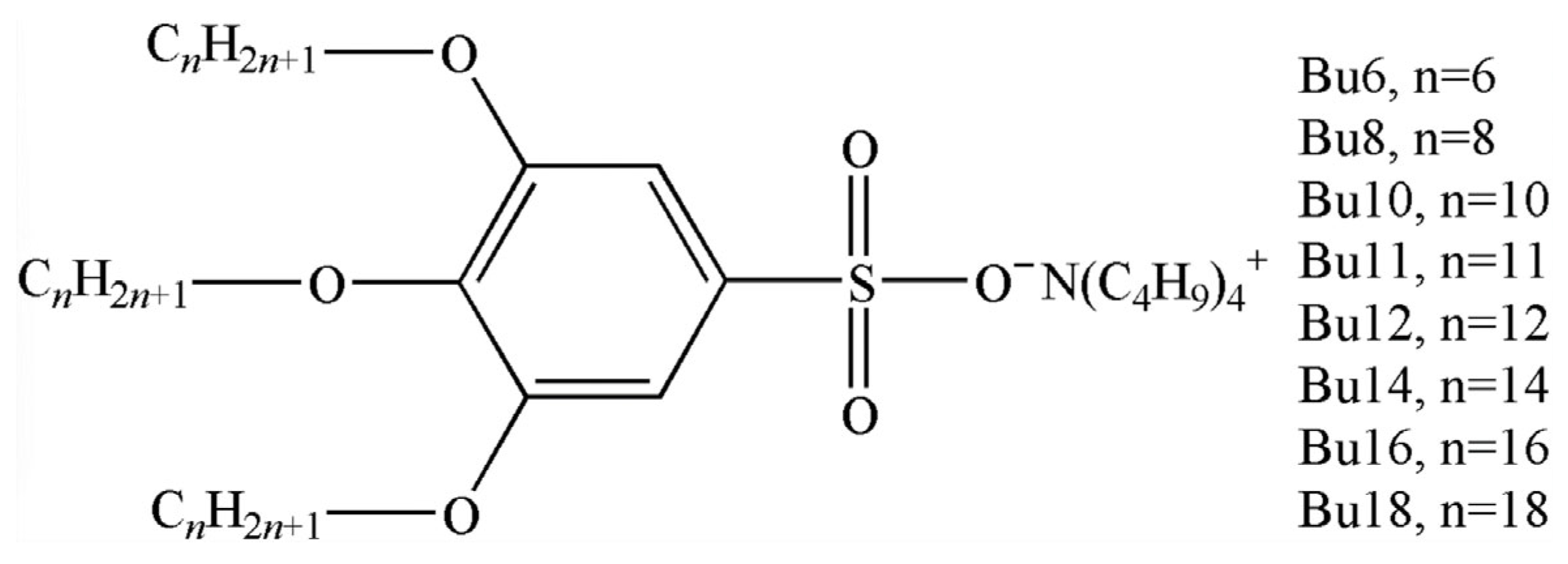 - Stupnikov, A.A.; Bakirov, A.V.; Shcherbina, M.A.; Beginn, U.; Möller, M.; Chvalun, S.N. The Effect of Aliphatic Chain Length on the Self-Assembly of Wedge-Shaped Cesium 3,4,5-Tris(Alkyloxy)Benzenesulfonates. Mol. Syst. Des. Eng. 2023, 8, 181–188. [Google Scholar] [CrossRef]