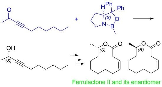 18. Keinan, E.; Sinha, S.C.; Singh, S.P. Thermostable enzymes in organic synthesis. 5. Total synthesis of S-(+)-Z-dodec-3-en-11-olide (Ferrulactone II) using a Thermoanaerobium brockii alcohol dehydrogenase-generated bifunctional chiron. Tetrahedron 1991, 47, 4631–4638. [Google Scholar] [CrossRef]