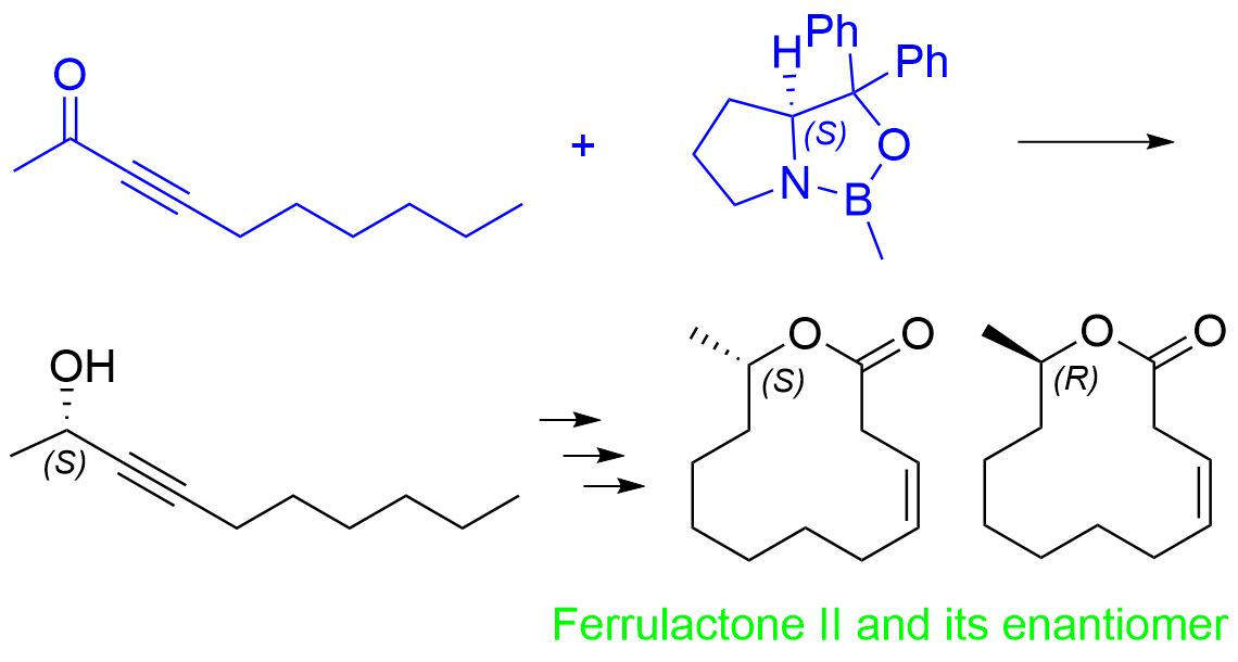 Herein, we report an enantioselective synthesis of Ferrulactone II (S)-1 and its enantiomer (R)-1 (Scheme 1). The key steps of this route include CBS reduction, Yamaguchi esterification, and Mitsunobu-macrolactonization with inversion of the chiral hydroxyl group. Overall, the approach features a concise seven-step sequence with a high overall yield, avoids the use of protecting groups, and enables access to both S- and R-enantiomers using a single chiral catalyst.