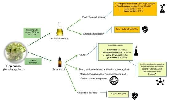 - Duarte, P.F.; do Nascimento, L.H.; Bandiera, V.J.; Fischer, B.; Fernandes, I.A.; Paroul, N.; Junges, A. Exploring the Versatility of Hop Essential Oil (Humulus lupulus L.): Bridging Brewing Traditions with Modern Industry Applications. Ind. Crops Prod. 2024, 218, 118974. [Google Scholar] [CrossRef]
