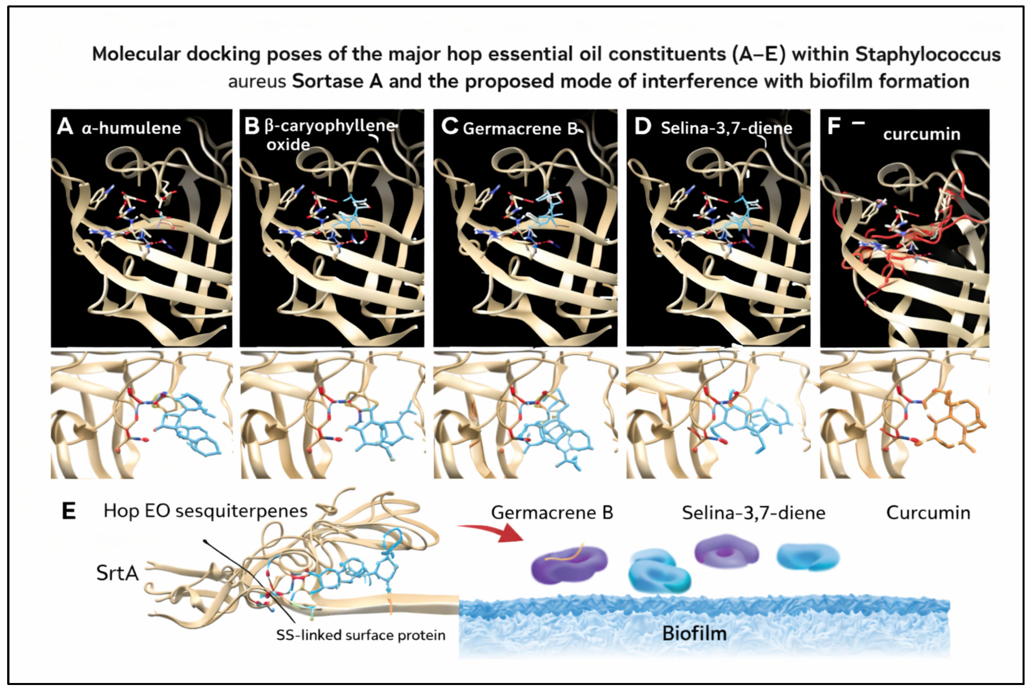 2.3.3. Molecular Docking of Hop Essential Oil Constituents with Sortase A