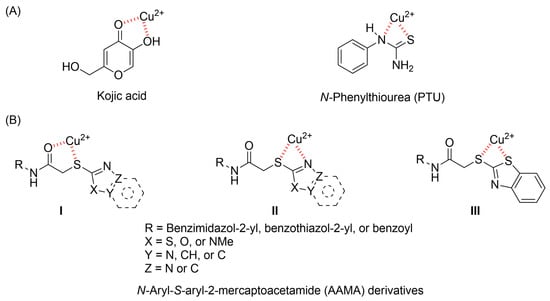 Copper ion chelation by (A) kojic acid (KA), N-phenylthiourea (PTU), and (B) N-aryl-S-aryl-2-mercaptoacetamide (AAMA) derivatives with three plausible copper-chelation modes.