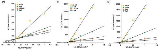 Lineweaver–Burk (L–B) plots of AAMA derivatives obtained from the kinetic experiments conducted using mTYR. (A–C) represent L–B plots of 5, 9, and 10, respectively. Derivatives 5 and 9 were tested at 0, 1.25, 5, and 20 μM, and derivative 10 was tested at 0, 4, 16, and 64 μM. The substrate, l-DOPA, was used at 1, 2, 4, 8, and 16 mM.