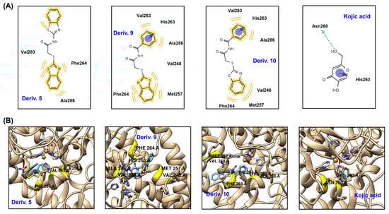 Docking simulation results between AAMA derivatives 5, 9, and 10 and KA and mTYR (2Y9X) using AutoDock Vina 1.2.0 software. (A) 2-Dimensional (2D) and (B) 3D pictures. The 2D and 3D pictures were acquired using LigandScout 4.4.8 software. The blue and green arrows represent π-π stacking and hydrogen bonds, respectively, and the yellow wave represents HP interactions.