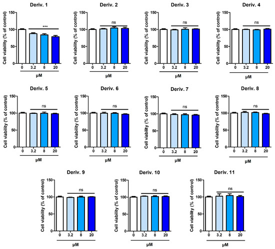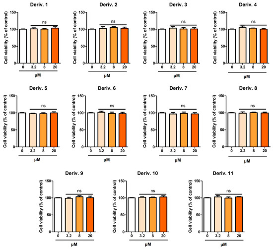 Cytotoxic effects of AAMA derivatives 1–11 in Hs27 cells. After AAMA derivatives (3.2, 8, and 20 μM) were administered to Hs27 for 24 h, cell viability was determined using an EZ-Cytox assay. ns, not significant.