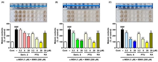 Inhibition effect of AAMA derivatives on B16F10 cellular melanin content. Derivatives 2 (A), 5 (B), and 6 (C) were used as test samples, and PTU and KA were used as positive reference substances. KA was tested at 20 μM, whereas 2, 5, 6, and PTU were tested at three different concentrations (3.2, 8, and 20 μM). Following 1 h of sample treatment, stimulators (IBMX/α-MSH [200 μM/1 μM]) were administered to B16F10 cells for 72 h. * p < 0.05, ** p < 0.01, and *** p < 0.001 vs. group treated with stimulators; ### p < 0.001 vs. control.