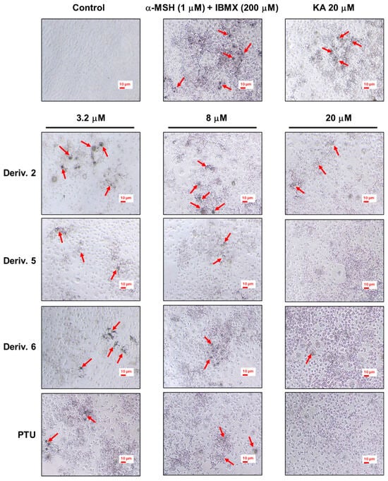 In situ B16F10 cTYR inhibition effects of derivatives 2, 5, and 6. These derivatives were used as test samples, and PTU and KA were used as positive reference substances. KA was tested at 20 μM, whereas 2, 5, 6, and PTU were tested at concentrations of 3.2, 8, and 20 μM. Following 1 h of sample treatment, stimulators (IBMX/α-MSH [200 μM/1 μM]) were administered to B16F10 cells for 72 h. Following l-DOPA (2 mM) treatment for 2 h, melanin-stained cells were photographed to determine in situ cTYR activity. The red arrows indicate cells that are heavily stained with melanin.