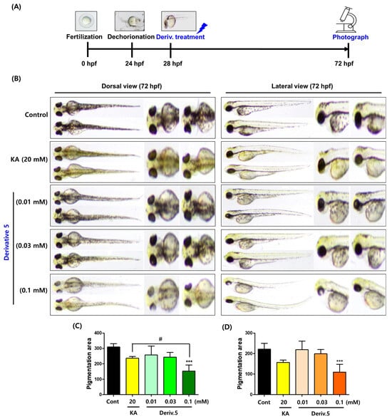 Pigment-reducing effects of AAMA derivative 5 in zebrafish larvae. (A) Time-based manipulation. (B) Zebrafish photos (dorsal and lateral views). They were taken at 30× magnification. (C,D) Pigmentation area in the dorsal and lateral views, respectively. KA (kojic acid; 20 mM) was used as a positive control. Derivative 5 was tested at three concentrations of 0.01, 0.03, and 0.1 mM. *** p < 0.001 vs. control; # p < 0.05 vs. KA.