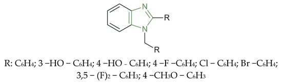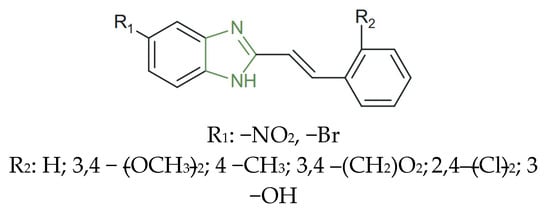 The series of 5-(nitro/bromo)-styryl-2-benzimidazoles (previously presented in Figure 4) was evaluated for in vitro antibacterial activity against S. aureus, E. coli, E. faecalis, and K. pneumoniae bacterial strains, emphasizing the antibacterial activity of all compounds. The most active analogues, the compounds containing a para-nitro substituent, demonstrated enhanced efficacy, with MIC values of 1 µg/mL against S. aureus and 4 µg/mL against E. coli and K. pneumoniae, comparable to ciprofloxacin (MIC ≈ 0.19–0.78 µg/mL); the bromo-substituted compounds also exhibited balanced activity against both bacterial groups [69].