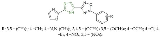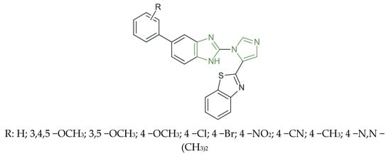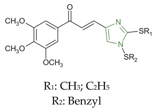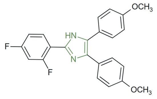 Imidazole is the main structure of many well-known compounds of the human organism, such as histidine, histamine, vitamin B12, biotin, and purines, which is formed by fusion with the pyrimidine nucleus [3,4,5,6,7,8]. At the same time, it is a component of many molecules with therapeutic effect, both natural and synthetic, such as cimetidine, azomycin, delamanid, and metronidazole. More recently, derivatives with various biological activities and pharmacological properties, including antimicrobial, antiviral, antifungal, anti-inflammatory, and anticancer effects, were obtained by substitution of the imidazole nucleus [9,10,11,12,13,14,15,16,17,18,19,20,21,22,23].