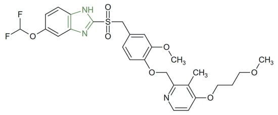 - Rajesh, R.; Manikandan, A.; Sivakumar, A.; Ramasubbu, C.; Nagaraju, N. Substituted Methoxybenzyl-Sulfonyl-1H-Benzo[d]Imidazoles Evaluated as Effective H+/K+-ATPase Inhibitors and Anti-Ulcer Therapeutics. Eur. J. Med. Chem. 2017, 139, 454–460. [Google Scholar] [CrossRef]