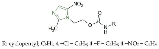 - Martínez-Rosas, M.E.; Quiroz-Cruz, S.; Valdés-Casillas, A.; Rivas-García, I.; Guzmán-Delgado, N.E.; Álvarez-Hernández, A.A.; Ramírez-Mendoza, M.J.; González-Castro, M.A.; Chávez-Munguía, B.; Reyes-Batlle, M.; et al. Imidazole Carbamates as a Promising Alternative for Treating Trichomoniasis. Molecules 2024, 29, 2585. [Google Scholar] [CrossRef]
