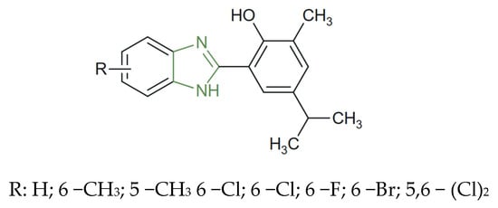 - Bhoi, P.; Sahoo, U.; Dash, D.; Behera, A.K.; Behera, R.K. An Efficient Synthesis of Rearranged New Biologically Active Benzimidazoles Derived from 2-Formyl Carvacrol. Res. Chem. Intermed. 2022, 48, 401–422. [Google Scholar] [CrossRef]